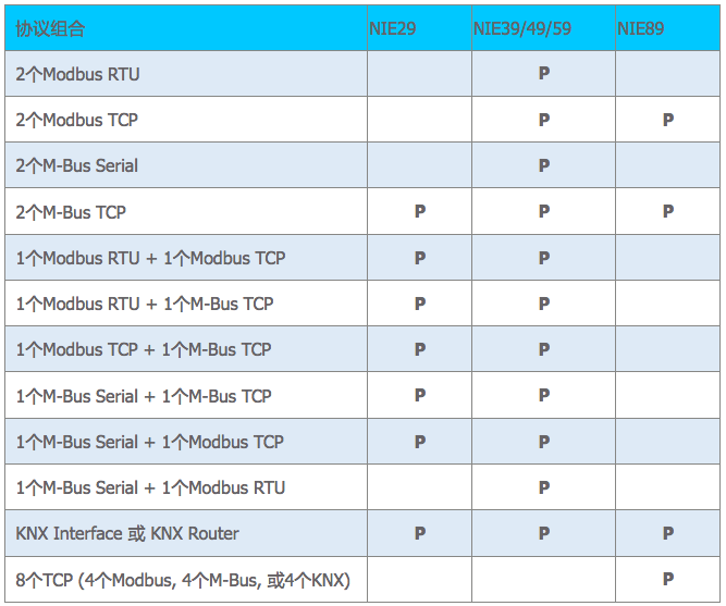 NIE亦有不同點(diǎn)數(shù)規(guī)模的選擇,包括NIE29,NIE39和NIE49可處理2500點(diǎn)對(duì)象,NIE59處理5000點(diǎn)對(duì)象,NIE89處理10000個(gè)對(duì)象點(diǎn)。由于不同型號(hào)的NIE所具備的串口數(shù)量不同,因此當(dāng)它們裝載兩種協(xié)議驅(qū)動(dòng)時(shí),具有如下組合規(guī)律: